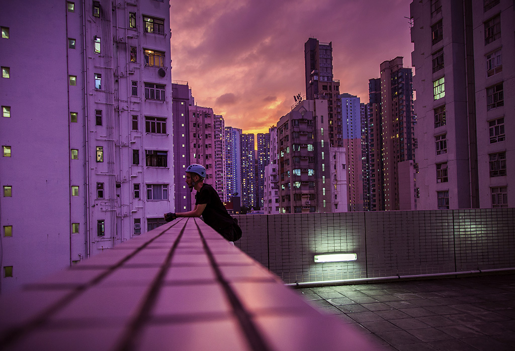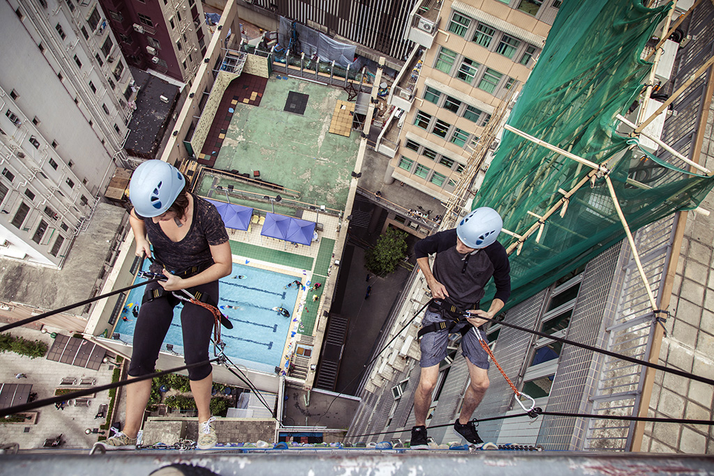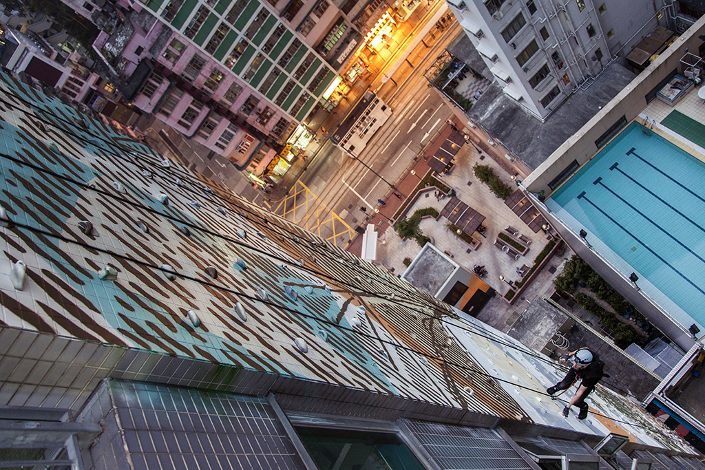According to the gallery, the wall itself can only be painted in harnesses with abseiling equipment as there is no platform for scaffolding. After one day of training, Cyrcle was able to start repainting the wall dangling 14 stories in the air with a bag full of spray. Not an easy task!