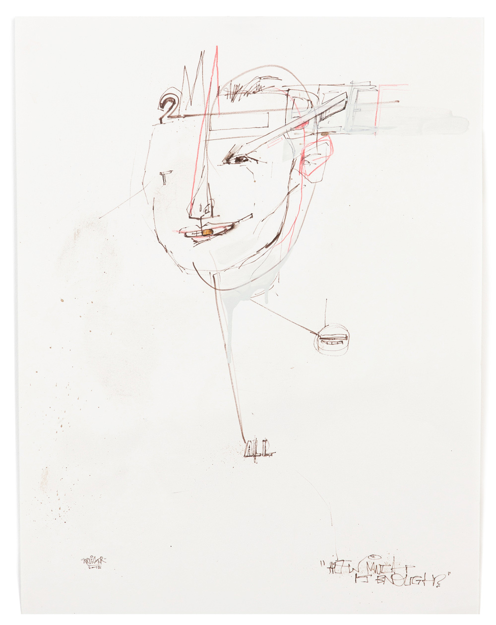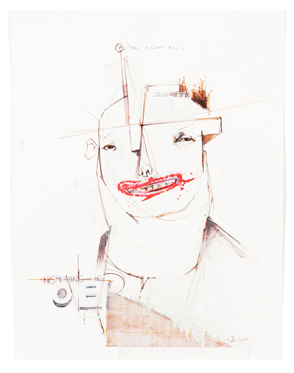 Putting drawing consciously at the center of his work, Tobias Kroeger focuses this time on the nature of the sketch bringing up references to his own background and German neo-expressionism such as the “Neue Wilde” or “New Wild” movement. His drawings become lighter and more expressive integrating fonts, drippings and fluid lines that in many ways define a new phase in his artistic career. One thing remains the same and this is his concern with existential questions regarding our modern society and aspects such as authenticity, identity and manipulation. „FOOLS“ explores in this way “whether we are all being ‘fooled’ and on the way to a „dystopian“ society” without even realising it.