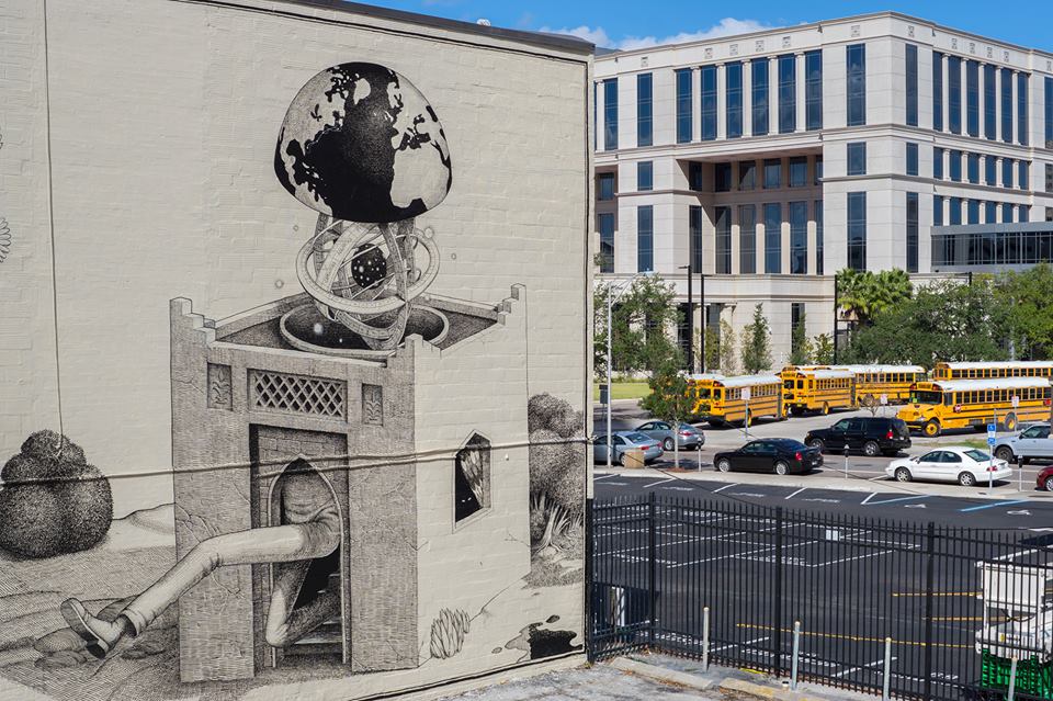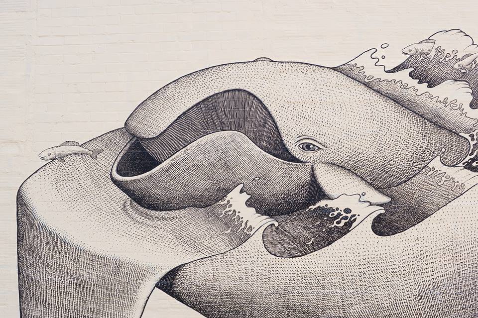 Ukrainian artist Waone from the popular ex-duo Interesni Kazki, began experimenting with black and white murals around a year ago in India. This new wall represents a continuation of that journey.Titled “Danger of Extinction” and painted for Pangea Seed, Sea Walls: Murals for Oceans and Artsynonym in collaboration with Art RePublic in Jacksonville, Florida, the new mural aims to raise awareness about the North Atlantic whales, one of the most endangered species of all large whales. Once abundant in the eastern and western North Atlantic, now fewer than 500 survive in a reduced habitat range along the East Coast of the United States and Canada, this despite protective measures adopted since the early 1930s. A sad reality for many species.