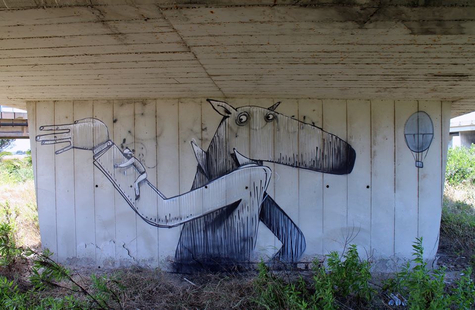 One of his most recent walls is this one painted for this year’s RestART Festival in Imola, Italy, featuring his characteristic illustrative style (See image above).