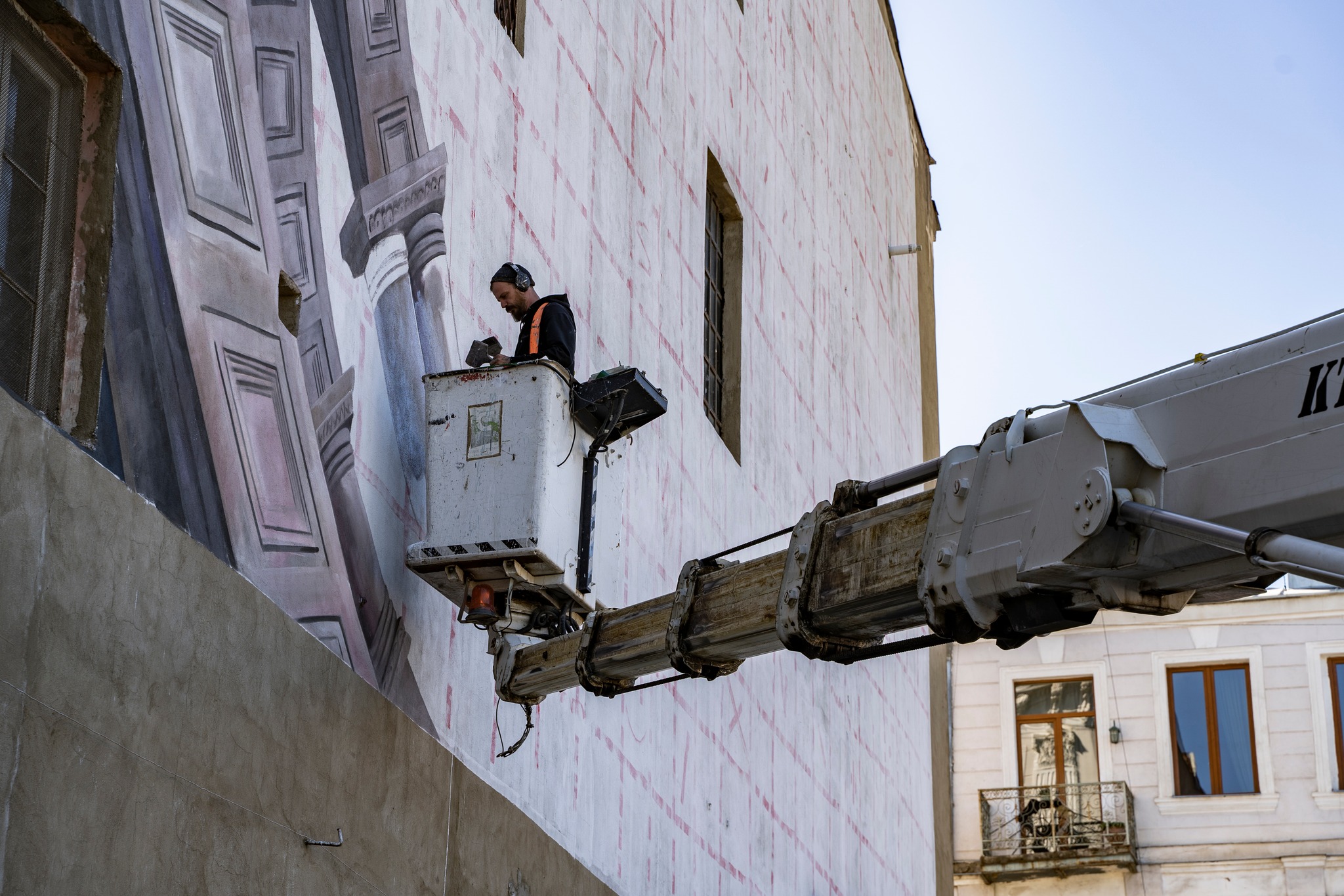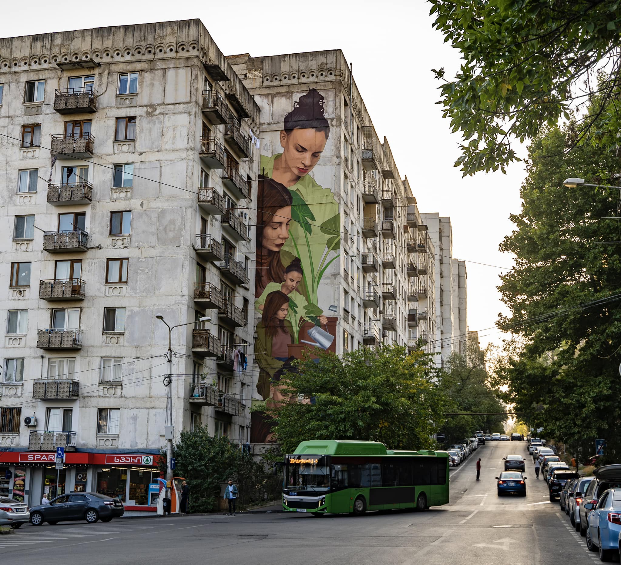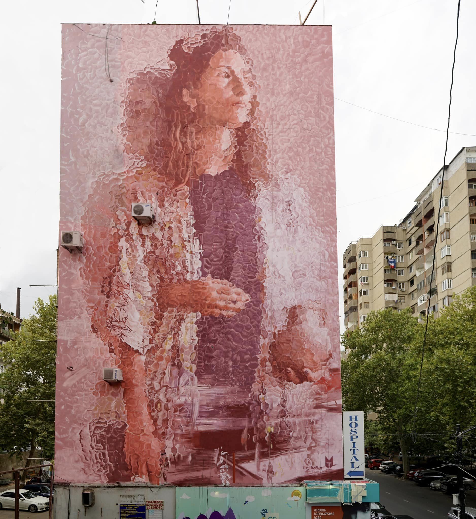 “When I came to Georgia, I took photos of people. This is a portrait of a woman, behind a mirror with her own child, holding a Georgian historical artifact. This shows the importance of culture and transmission from generation to generation. I painted with the effect of tilted glass, I wanted the person in the painting to be a universal person, because it can be anyone, that’s why it remains a little abstract. This wall was a great challenge for me. I have never done such a complex, detailed wall of this size before.”