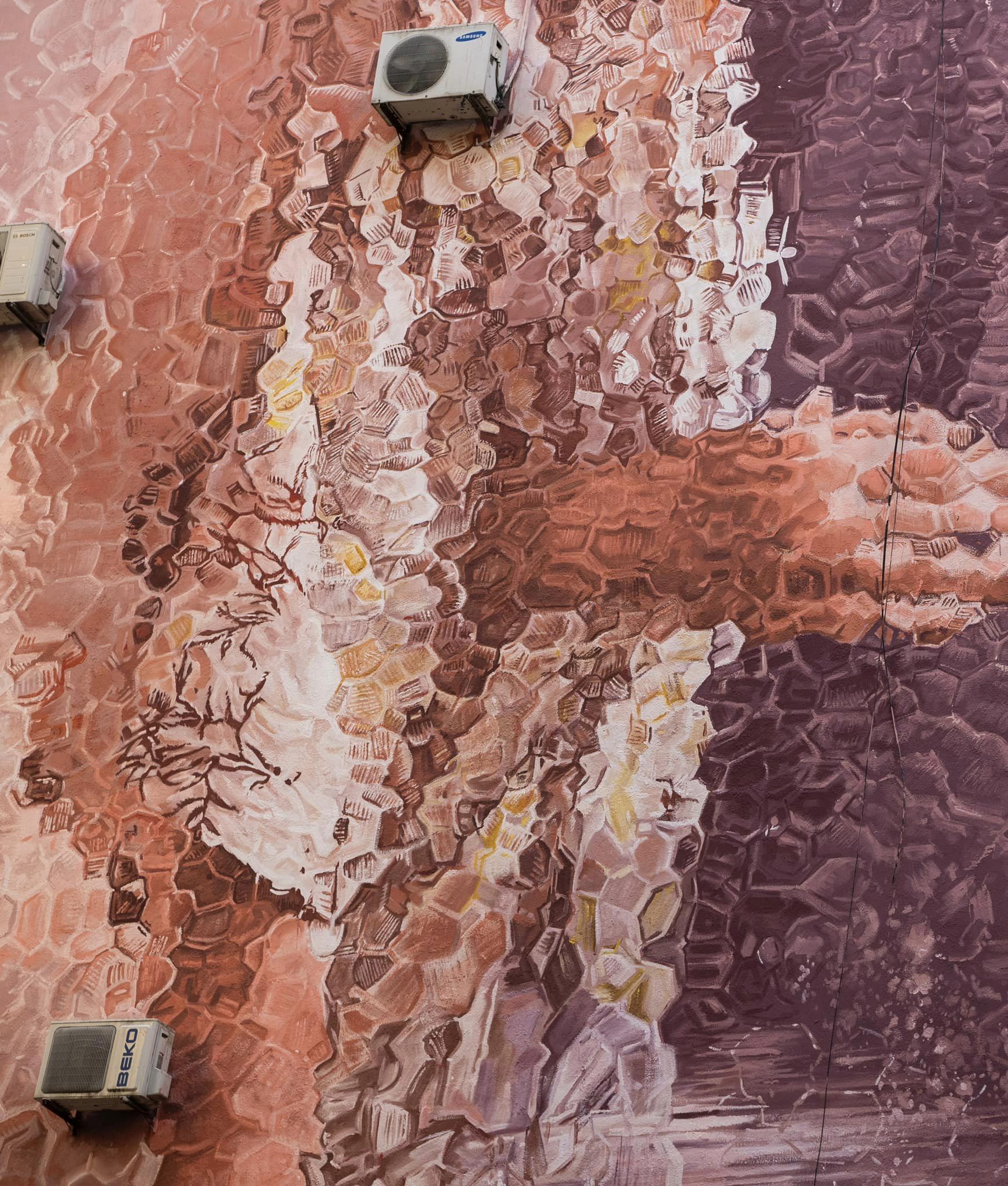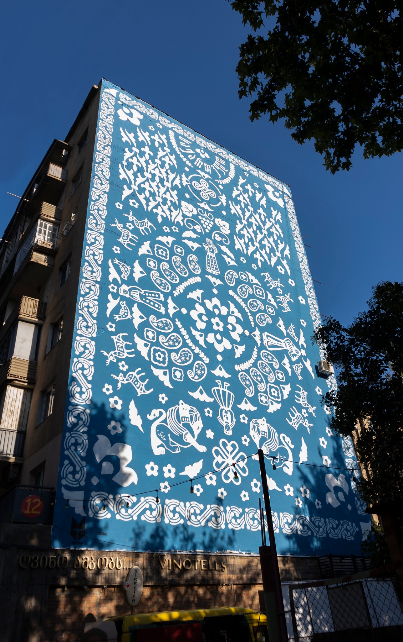 KERA and Tina Chertova went for two blue creations. KERA in his characteristic abstract approach while Chertov’s mural draws inspiration from Georgian traditional ornaments composing a Georgian blue tablecloth like patterns that she spread on the wall.