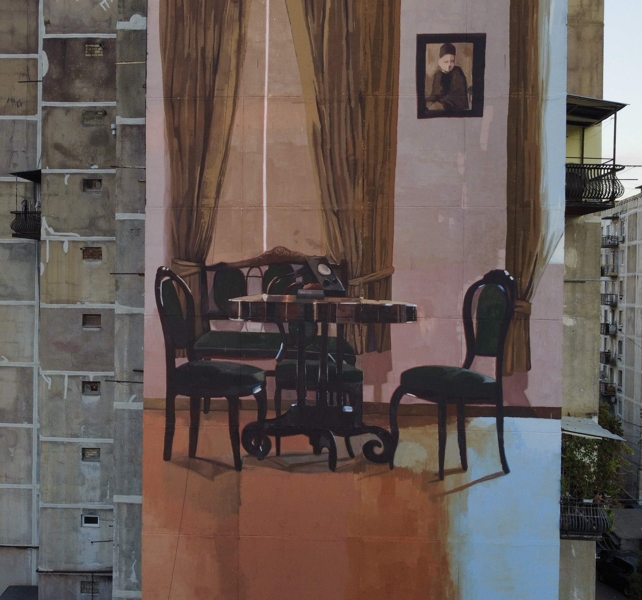 Mohamed l’Ghacham titled his mural Ilia’s room, depicting the living room of the famous Georgian thinker and author Ilia Chavchavadze a Georgian public figure, journalist, publisher, writer and poet who spearheaded the revival of Georgian nationalism during the second half of the 19th century and ensured the survival of the Georgian language, literature, and culture during the last decades of Tsarist rule. He is Georgia’s “most universally revered hero” and is regarded as the “Father of the Nation.”