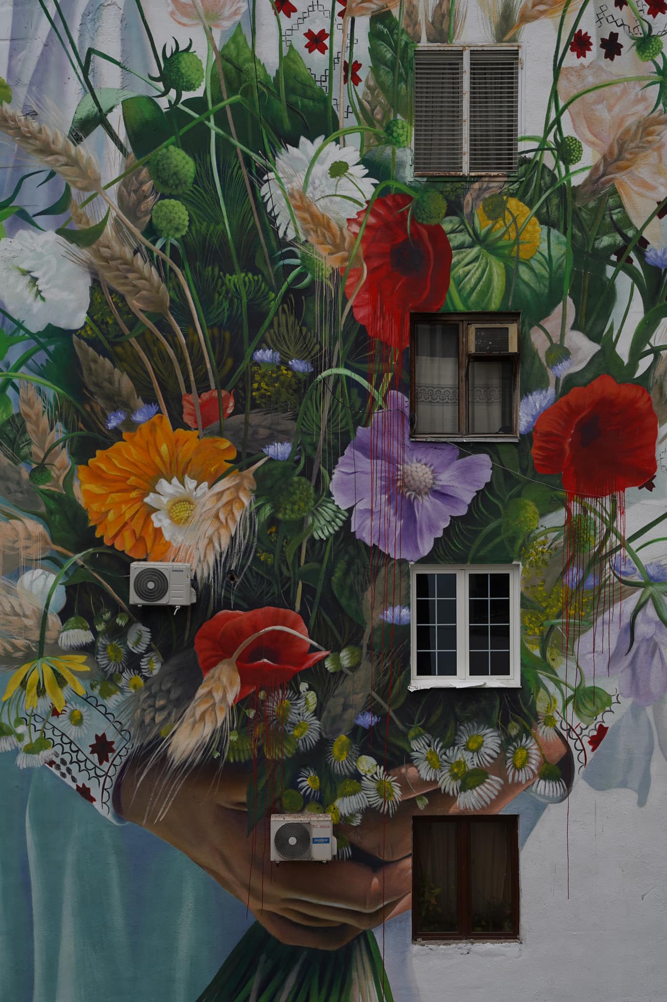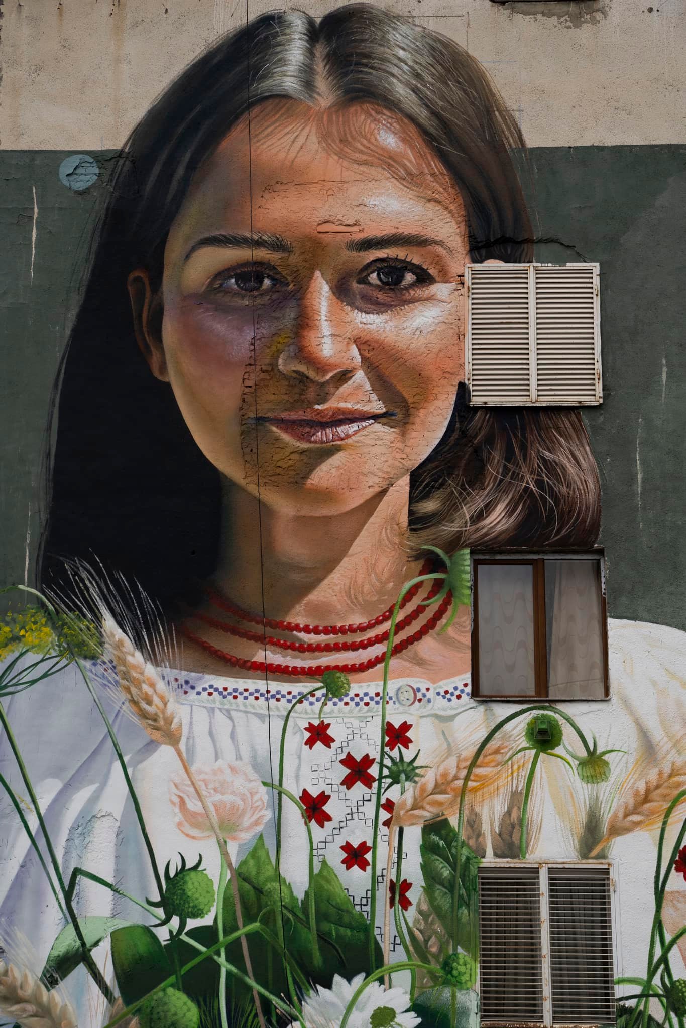 For the occasion, Sasha Korban painted a portrait of a Ukrainian woman in a traditional embroidered shirt holding a huge bouquet of wildflowers with ears of wheat, right in front of Russia’s embassy. Despite the terror of the war, the mural portrays the hope and strength of the Ukrainian people.